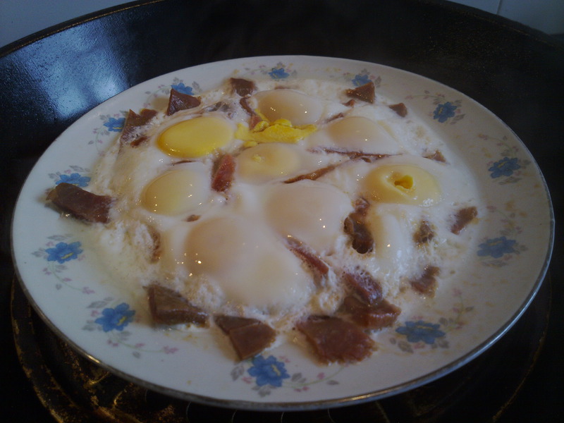 4、放到锅里头像蒸埋头那样蒸着...水开后中火有十几分钟味道进去就可以了...(其实火腿和鸡蛋都可以生吃的嘛)。
