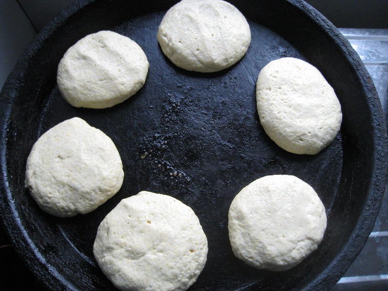1、白面玉米面各半发酵,踹好碱水,热锅放入,加半碗凉水,盖盖,中火。