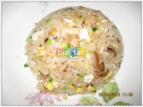 及以下步骤:成品图。 准备食材。 起油锅,把鸡蛋直接打在锅中,搅散,炒至熟出锅备用。 准备食材。 起油锅,把鸡蛋直接打在锅中,搅散,炒至熟出锅备用。 利用余油把鸡肉炒至五分熟加入香菇丝炒香。再加入咸虾酱炒至香味出来。 再就是加米饭拌匀。 再加入炒熟的鸡蛋。 撒上葱花。 成品图。