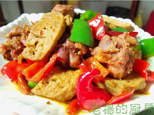 及以下步骤:鸭腿切块,用花椒水焯出过凉水。 素鸡切片煎双面金黄,一片切成两块。 鸭腿切块,用花椒水焯出过凉水。 素鸡切片煎双面金黄,一片切成两块。 鸭腿切块,用花椒水焯出过凉水。 素鸡切片煎双面金黄,一片切成两块。 青红辣椒切块。 用油把鸭子肥的地方先煎干,然后一起煸炒到出油,下干红辣椒,姜片,八角,豆瓣酱,炒匀。 一汤匙生抽,一汤匙老抽,半汤匙糖,半瓶啤酒,大火煮开,转小火,炖到自己喜欢的程度。 转炒锅收汁,放青红辣椒片,出锅放点鸡精或者味精,即可。