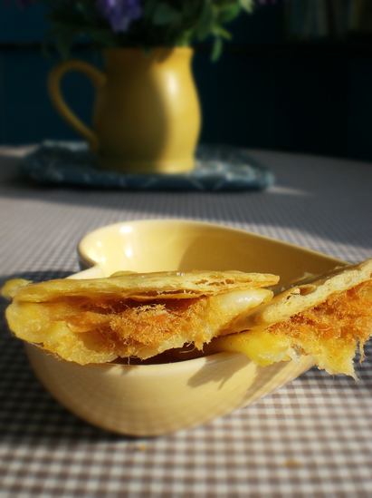 4、肉松上盖上奶酪。