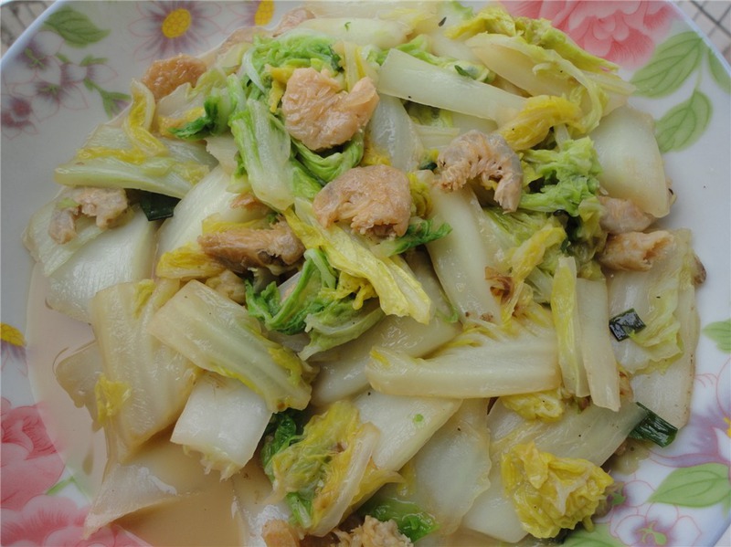 3、然后放入大白菜炒,再入少量的水烧熟放胡椒粉就可以了。