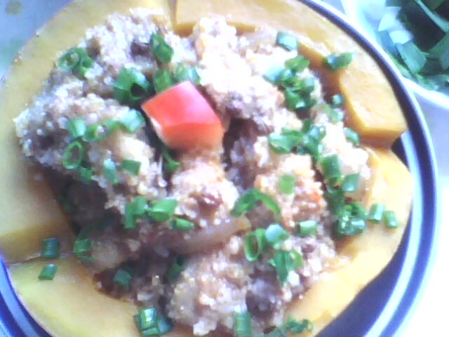 及以下步骤:南瓜去瓤加适量盐洗净外皮 五花肉切薄片 姜蒜切碎 葱切花。 取一碗加料酒 胡椒 蒜姜末 老抽 芝麻红油 盐调汁 南瓜去瓤加适量盐洗净外皮 五花肉切薄片 姜蒜切碎 葱切花。 取一碗加料酒 胡椒 蒜姜末 老抽 芝麻红油 盐调汁 南瓜去瓤加适量盐洗净外皮 五花肉切薄片 姜蒜切碎 葱切花。 取一碗加料酒 胡椒 蒜姜末 老抽 芝麻红油 盐调汁 用调好的汁腌制五花肉10分钟。 加米粉少量水充分拌匀五花肉 装入南瓜盅。 放入开水蒸锅内蒸30分钟。 撒葱花 可吃咯。