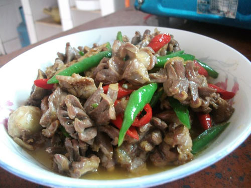 很实惠的一道菜,三副鸡杂才买了五块钱,加上辣椒之类的配料总共不到七块钱,所以有时间的朋友还是自己下厨吧。