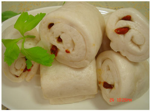及以下步骤:面粉200克.枸杞约15克. 面粉加入发酵粉用35度右左的温水和成光滑面团用保鲜膜包好进行发酵 面粉200克.枸杞约15克. 面粉加入发酵粉用35度右左的温水和成光滑面团用保鲜膜包好进行发酵 面粉200克.枸杞约15克. 面粉加入发酵粉用35度右左的温水和成光滑面团用保鲜膜包好进行发酵 枸杞洗净用餐巾纸吸干水份备用 发好的面揉出气泡杆开.将枸杞均匀滴撒在上面. 从一头卷起. 切成大小均匀的剂子入锅蒸十五分钟即可.