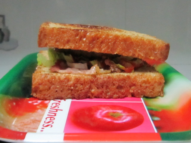 3、开始拼装三明治:1片吐司片上面放上培根,再放生菜丝,挤辣椒酱,放上意式肉饼,再挤辣椒酱(老公嗜辣)最后盖上吐司片。能量三明治早餐完成!