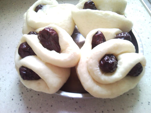 及以下步骤:在下半面放上几颗枣,我家的枣比较大,3颗就够了。 然后盖上上半面 在第一层的空隙处再放一颗枣 然后对折整理一下 依次处理好,排好队,照个像。 上锅了,我用的是电磁炉,1500w,上气儿后10分钟,停火后等3分钟再开锅盖。 打开锅盖,花儿样枣卷对着我笑了。 看看这四个枣卷,前三个是上屉的,那个平平的是下屉的,明显被压制了。 谁家熬稀饭了,咱们搭伙吃吧! 最后再晒一下,准备参赛了
