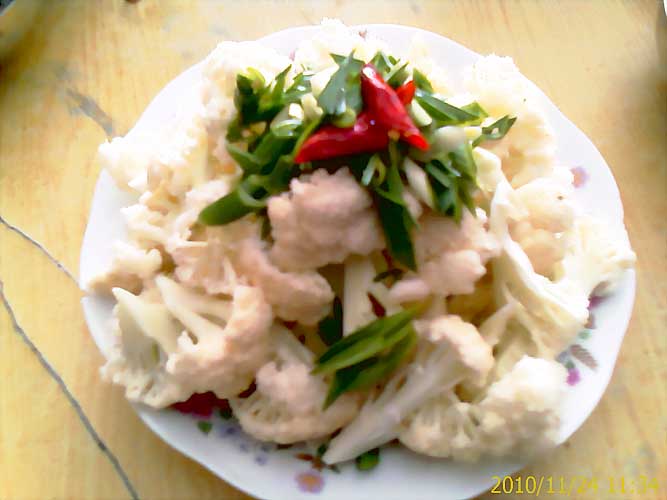 6、3:放入切好的花菜,吵到熟加盐,味精,鸡精即可。