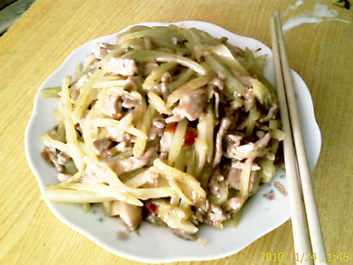 5、炒好的肉丝先装盘待用。(手机照的,效果不怎么好哦)