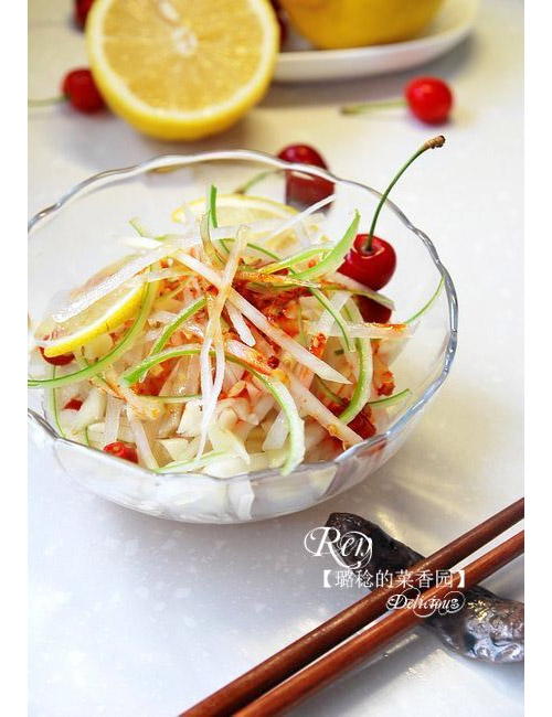 及以下步骤:另取一个小碗,将小葱、蒜末放入,加生抽一勺、香醋两勺、油泼辣椒一勺、鸡精少许。 切几片新鲜柠檬垫在碗底,将苤兰丝码在其上,将调拌好的调料汁浇在上面,最后少来一点麻油,香哦! 现做现吃,绝对鲜嫩。 将切好的细丝在清水中泡1-2分钟,这是去掉生涩味的第一步。 捞至蓝中沥干水分。 接下来,在苤兰丝倒入碗中,加入一小勺盐,俗称“杀水”。 “杀过水”的苤兰丝口感更加脆韧。 另取一个小碗,将小葱、蒜末放入,加生抽一勺、香醋两勺、油泼辣椒一勺、鸡精少许。 切几片新鲜柠檬垫在碗底,将苤兰丝码在其上,将调拌好的调料汁浇在上面,最后少来一点麻油,香哦! 现做现吃,绝对鲜嫩。