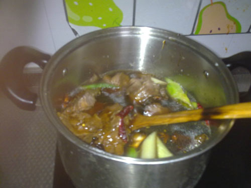 5、大火煮开,加入羊蝎子然后慢慢炖上2个小时,让肉充分入味。为了颜色更好看,我在原汤里加了老抽,让颜色看起来更诱人!