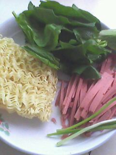5、菠菜用开水烫过,然后分别把火腿丝和烫好的菠菜码入面中。