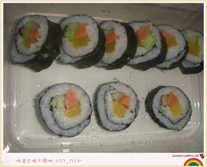 及以下步骤:再,均匀的切出来。。。效果很不错哟哈哈~ 准备材料。 将米饭平铺在紫菜上。 准备材料。 将米饭平铺在紫菜上。 放入黄瓜条、萝卜条、香肠等食材。按个人喜好放入。 用力将紫菜卷起。 这是个半成品,o(∩_∩)o哈哈~ 看着挺不错吧。oye. 再,均匀的切出来。。。效果很不错哟哈哈~
