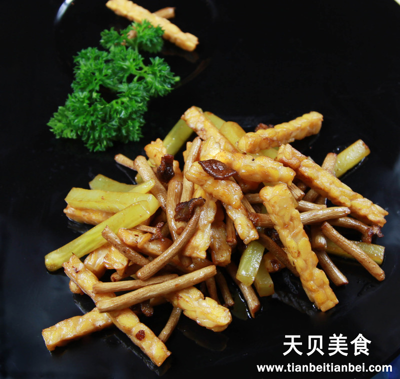 及以下步骤:天贝切条,过油炸至金黄色,捞出备用。 莴笋去皮,切条备用。 天贝切条,过油炸至金黄色,捞出备用。 莴笋去皮,切条备用。 天贝切条,过油炸至金黄色,捞出备用。 莴笋去皮,切条备用。 天贝切条,过油炸至金黄色,捞出备用。 茶树菇洗净,切段,过油炸至七八成熟捞出备用。 莴笋去皮,切条备用。 锅热放油,倒入炸好的天贝和茶树菇,翻炒几下,接着放入盐和老抽(上点色就行),最后放入莴笋条,翻炒几下即可。