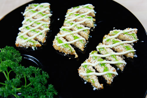 5、炸好的天贝切成菱形状装盘,上面交叉挤上山药酱和猕猴桃酱即可。