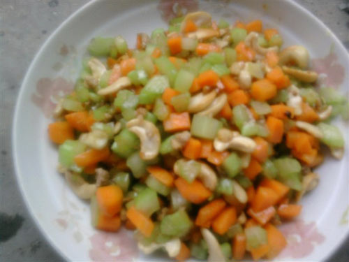 1、肉末150克,胡萝卜丁150克,芹菜250克,腰果50克。
