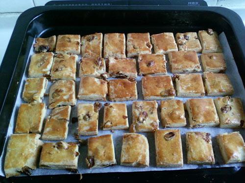 及以下步骤:把面团擀成厚1-2cm的面片。 切成等份的小方块,我切的不大规则,随心而欲呵呵。放入烤盘,盘底铺层油纸。 最后刷上蛋液,烤箱预热180度,中层加热,15分钟,又香又好吃的奶香葡萄饼干就出炉了。 分次加入蛋黄液,搅拌均匀后加入下一次。 搅拌均匀的样子。 低分过筛倒入上图中的液体,用手把液体和面粉混合均匀。 倒入葡萄干,我没有朗姆酒,就用的温水呵呵。搅拌均匀,揉成面团。 把面团擀成厚1-2cm的面片。 切成等份的小方块,我切的不大规则,随心而欲呵呵。放入烤盘,盘底铺层油纸。 最后刷上蛋液,烤箱预热180度,中层加热,15分钟,又香又好吃的奶香葡萄饼干就出炉了。