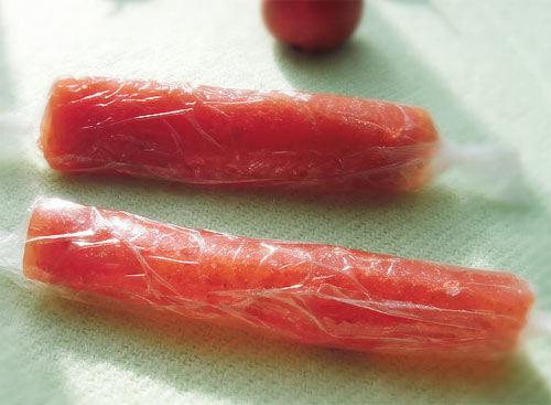 我家小朋友喜欢吃果丹皮,每次去超市孩子要买的总是果丹皮或者山楂片,看看上面的配料表,吃起来总是不放心,前几天买了几斤山楂,本想着做山楂果酱,在果酱做好之后,忽然想起了做果丹皮,没想到还真做成功了。 看看自制的果丹皮,颜色要比市售的浅好多。