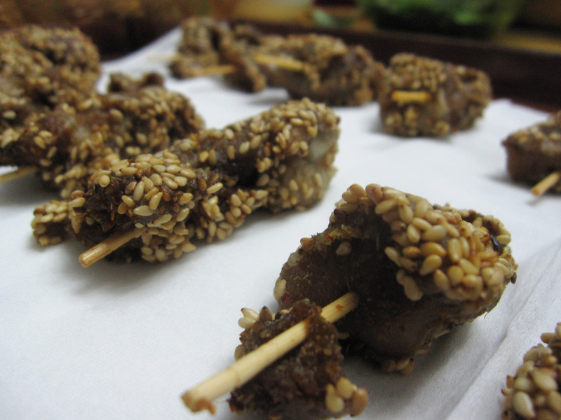 5、猴头菇串沾满面糊,不要太厚,在芝麻中滚一下。