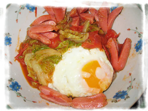 盐(适量) / 五香粉(适量) / 番茄(适量) / 白菜叶(适量) / 香肠(适量)