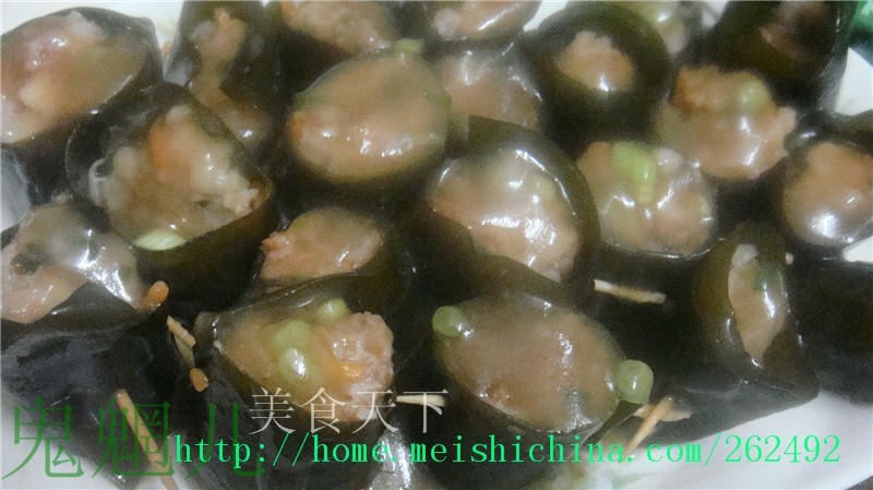及以下步骤:剩下的肉也不能浪费,包饺子拉。 好香哦,大家快试着做做吧。 海带洗干净备用。 猪肉然后洗干净剁粹。 然后加入胡萝卜粹,适量 海带切成长方型然后放上 卷成圆桶型,插上 然后拿到以烧开中的水中蒸上十几分钟,蒸好后等不烫手切成一段段摆盘,另一干净的锅烧上半碗水加入水淀粉,鸡精,盐,葱,胡椒粉沟成粘稠的汤汁,最后淋就大功告成。 剩下的肉也不能浪费,包饺子拉。 好香哦,大家快试着做做吧。