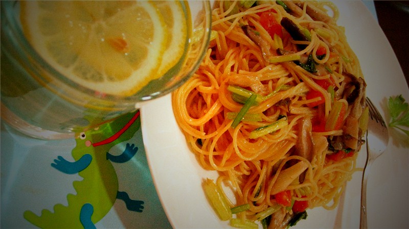 6、接着,锅里面放入油,加一点黄油溶化,热了之后放入口蘑,芹菜茎,加点盐翻炒,再倒入意粉翻炒,根据个人口味适量加入番茄汁,翻炒,加盐,少量糖,稍微翻炒入味了就可以了~简单吧~~因为是早餐,你也可以加入培根或者煎蛋~~一杯柠檬蜂蜜茶开始美好的一天。