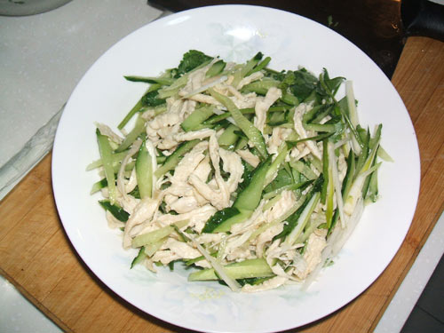 及以下步骤:黄瓜切丝,嘻嘻。怎么切就不不用说了吧(顺便再把葱也切成丝)。 鸡胸肉洗净煮熟(煮时放些花椒以免在拌时有腥味),半小时左右。 黄瓜切丝,嘻嘻。怎么切就不不用说了吧(顺便再把葱也切成丝)。 鸡胸肉洗净煮熟(煮时放些花椒以免在拌时有腥味),半小时左右。 黄瓜切丝,嘻嘻。怎么切就不不用说了吧(顺便再把葱也切成丝)。 鸡胸肉洗净煮熟(煮时放些花椒以免在拌时有腥味),半小时左右。 黄瓜切丝,嘻嘻。怎么切就不不用说了吧(顺便再把葱也切成丝)。 将煮好的鸡胸肉撕成丝(顺着肉的纹理撕,好看)。 将鸡丝和黄瓜丝放入容器中(喜欢香菜的可以放些香菜调味),调入盐、胡椒粉、香油、芝麻拌匀。装盘即可。 来张装盘后的。调料也可以换成芝麻酱之类的,或者酸甜汁。如果用酸甜汁大家可以在加些粉丝金针菇之类的。