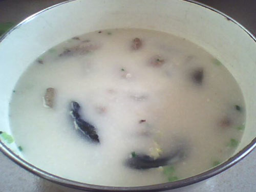 7、煮至7分钟后倒入皮蛋,入味(盐,味精,鸡精),换上中火煮至3、4分钟。