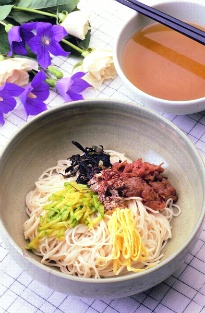喜面 喜面也叫做‘温面’,是将细细的面条或荞麦面泡入热酱汤里,再放上菜码儿的美食。从以前开始,生日或是宴会等喜庆的, 特别的日子里,一定要用面条招待客人,生日时吃面条含有像面条一样长寿的意思,而结婚时吃面条则含有期望新郎新娘的结合长长久久的意思。