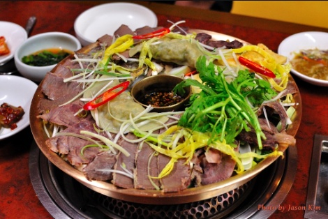 牛肉蘑菇锅面 牛肉蘑菇锅面是在圆形铜盘里,放入胸肉,牛舌,胸口肉等肉片和大葱,银杏,鸡蛋丝,豆腐,蘑菇等蔬菜,再加上荞麦面一起,放入清淡的牛肉汤后边煮边吃的美食。胸肉也叫做‘鱼腹’,因此这道菜也叫做‘鱼腹铮盘’,是很多人围坐着一起吃的北方料理的代表。北方地区山地较多,土地贫瘠,气温较低,因此多产荞麦;同时因生活不宽裕常常不能吃到牛的精肉部分,因此使用其他部分作牛肉蘑菇锅面。