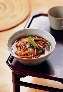 辣味牛肉汤 辣味牛肉汤是将牛肉和葱, 蕨菜, 绿豆芽, 芋头等蔬菜放入锅中熬煮成的, 味道非常辣的汤。在闷热的夏季,丧失食欲的时候,这道菜当然对恢复元气有很大的帮助。在韩国有三伏天吃狗肉汤的习惯,为了那些不能吃狗肉的人准备的, 放入牛肉做成的这道菜,韩语的名字叫做‘肉狗酱’,这里的 ‘肉’指的就是牛肉。