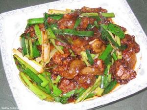5、下豆瓣酱和甜面酱,炒香上色(看到油色红亮) 先下青蒜苗头(白色部位),略炒闻香在下蒜苗叶(绿色部分)同炒