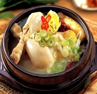 牛骨炖汤 参鸡汤是在小鸡的肚子里,加入糯米, 人参, 大枣, 蒜头等一起熬煮的食品。 鸡的种类有土鸡, 乌骨鸡等,也有放入中药材料做的韩方参鸡汤。