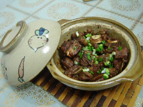 及以下步骤:来个近照~~~瞧~~~多下饭的菜啊~~~肉质肉汁都浓香~~~好吃又不上火~~~ 排骨洗净后, 用清水稍微泡一会, 把血水稍微泡出来些. 把调味料按量调均,红糖和米酒个一汤匙,生抽和陈醋各三汤匙; 排骨捞起沥干水分,放入姜片 排骨洗净后, 用清水稍微泡一会, 把血水稍微泡出来些. 把调味料按量调均,红糖和米酒个一汤匙,生抽和陈醋各三汤匙; 排骨捞起沥干水分,放入姜片 把调味料拌入排骨, 充分拌匀, 然后倒入小砂煲里面腌制入味三小时左右. 经过腌制后已有不少汁水的了, 开大火烧开煮两分钟后转为小火, 慢慢熬制. 约摸十分钟, 开盖翻动一下. 再过十分钟后, 观察里面的水分剩余, 水分不多的时候, 颜色已经很漂亮的了,再搅动使得每个排骨上色.即可关火. 撒上葱花, 即可上菜了~~~这会啊,浓浓的排骨香味伴有淡淡的酒香, ~~~~~ 来个近照~~~瞧~~~多下饭的菜啊~~~肉质肉汁都浓香~~~好吃又不上火~~~