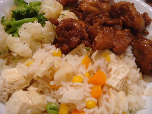 照烧鸡,双花,彩蔬笋丁豆腐拌饭,一顿简简单单的营养餐就是这么来的。放在饭盒里带饭也是不错的选择:) 这个饭做起来也很快,照烧鸡用炒菜锅煎,双花用小锅煮,拌饭用电饭煲蒸,互不冲突。我做的的时候三个基本同时做好,放在一起直接吃,呵呵。