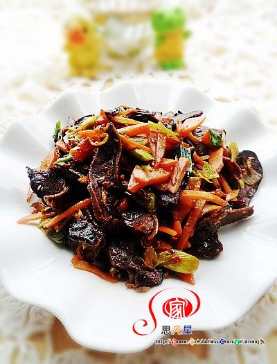 及以下步骤:出锅装盘。 材料切好备用。 热锅下油下姜丝煸香加入腊肝煎煎。 材料切好备用。 热锅下油下姜丝煸香加入腊肝煎煎。 倒少许料酒焖上1分钟。 然后加入酸胡萝卜、蒜苗加少许盐先炒入味。 再把一边的猪肝一起翻炒。 加入辣椒粉不停翻炒均匀,最后沿锅壁散少许水焖1分钟即可出锅。 出锅装盘。