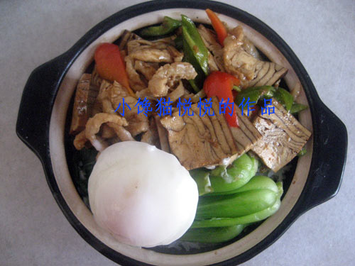 及以下步骤:饭做好后,就开始做菜了,往炒菜的锅里加少量的油把肉丝炒熟,盛盘备用。再加少量的油放入葱、姜把花干炒好,再入肉丝,加盐、胡椒、南德、一点点酱油(上色),最后加上红辣椒和青辣椒,鸡精,翻炒几下起锅,盛在砂锅的米饭上面。然后把小青菜也铺在米饭上。(注:菜可以随便搭配,喜欢吃什么菜就做什么菜放在米饭上就ok了)。 用只小碗里面放少许的盐,用开水化开,把鸡蛋打开顺着碗边滑进碗底,入微波炉,高火1-2分钟(喜欢吃嫩的就少点时间,喜欢吃老的就多点时间)。 把做好的微波炉合包蛋放在菜的上面就大功告成了。 猪肉切丝用盐、淀粉和料酒拌均 小青菜用盐水捞一下,备用,这张图片是生的,捞好的忘了照了,呵呵。 米加上水在砂锅里煮,先用中火煮开,然后用小火收浆。 饭收浆煮熟后,沿着砂锅边用小勺往里面加油,再用小火慢慢炕,贴着砂锅的那些饭就可以成锅巴了,嘻嘻,做这个的时候一定要有耐心。 饭做好后,就开始做菜了,往炒菜的锅里加少量的油把肉丝炒熟,盛盘备用。再加少量的油放入葱、姜把花干炒好,再入肉丝,加盐、胡椒、南德、一点点酱油(上色),最后加上红辣椒和青辣椒,鸡精,翻炒几下起锅,盛在砂锅的米饭上面。然后把小青菜也铺在米饭上。(注:菜可以随便搭配,喜欢吃什么菜就做什么菜放在米饭上就ok了)。 用只小碗里面放少许的盐,用开水化开,把鸡蛋打开顺着碗边滑进碗底,入微波炉,高火1-2分钟(喜欢吃嫩的就少点时间,喜欢吃老的就多点时间)。 把做好的微波炉合包蛋放在菜的上面就大功告成了。