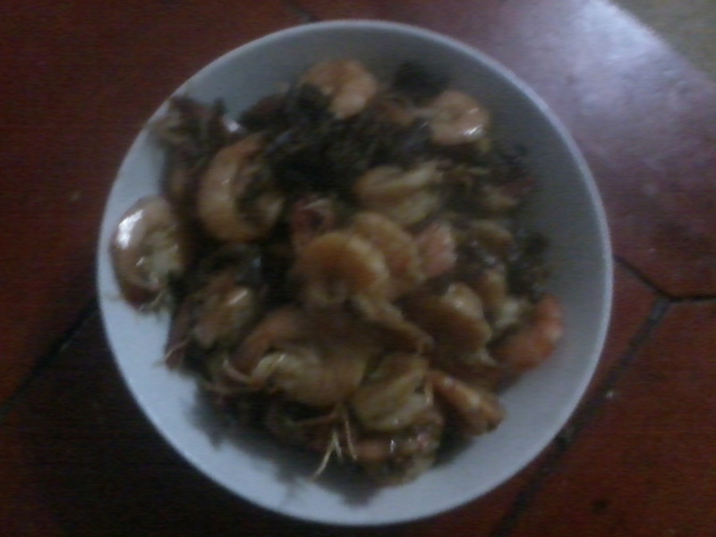 4、锅里放油,烧热后倒入虾翻炒,再放入梅干菜一起翻炒,加适量水,因为梅干菜比较咸,不需要放盐了,炒熟,好,起锅,完工!