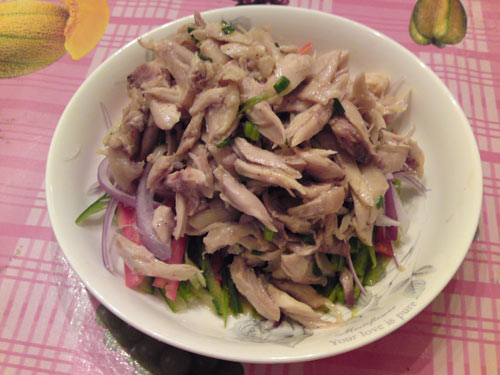 5、把拌好的手撕鸡倒在放有青、红椒丝、葱丝、洋葱丝的碟内,即可食用。