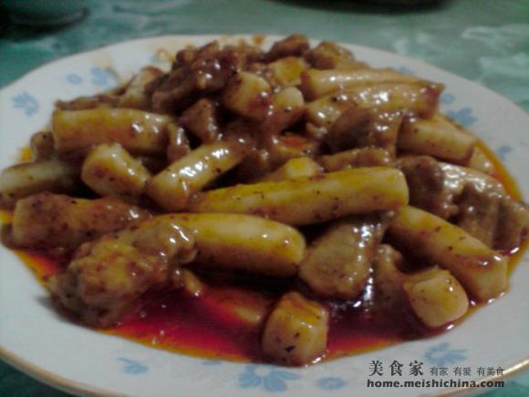 第一次在这上面发菜谱~ 也没有专业的相机,图片也不是太清楚,大家将就着看吧·· 为什么说是中国辣炒年糕呢?因为原创的吗,嘿嘿··· 发现家里还剩点前几天下火锅还没下完的年糕,就想做韩国辣炒年糕,可是又没有韩国辣酱,于是只能自创了,发现做出来,哇塞,不是一般的好吃唉··以至于我妈吃了一口想着第2口呢·· 到口里的感觉先是甜,然后是酸,最后是辣···一点也不输韩国辣炒年糕呢··