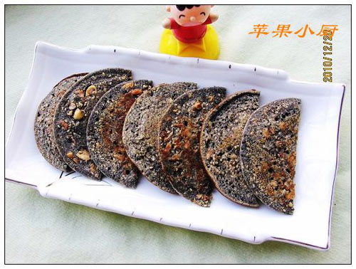 及以下步骤:将花生切成碎颗粒。 鸡蛋打散,加入白芝麻。 将花生切成碎颗粒。 鸡蛋打散,加入白芝麻。 将花生切成碎颗粒。 鸡蛋打散,加入白芝麻。 加入花生碎。 加入黑芝麻糊、泡打粉,加适量水调成糊。 用勺适量加入小不粘锅中小火慢烙。 转大不粘锅翻面再烙。