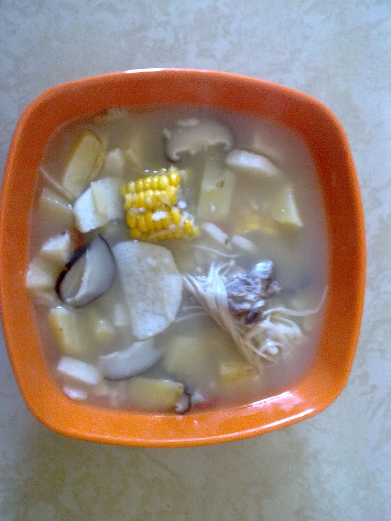 及以下步骤:玉米 土豆 山药洗净 然后切成小块 备用 准备好必须得食材,菇类先用清水冲洗备用 玉米 土豆 山药洗净 然后切成小块 备用 准备好必须得食材,菇类先用清水冲洗备用 玉米 土豆 山药洗净 然后切成小块 备用 准备好必须得食材,菇类先用清水冲洗备用 玉米 土豆 山药洗净 然后切成小块 备用 菇类撕成一丝一丝的 方便它出味 午餐 单单煲汤是不能满足我这个小馋虫滴 对了 还有我生活不可或缺的饮品--豆浆