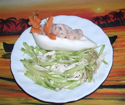 及以下步骤:鸡肉煮熟以后、放凉;用手撕成碎鸡丝备用。 把鸡用水煮2分钟、换成干净水、里面放花椒、大料、姜片炖煮1小时。 鸡肉煮熟以后、放凉;用手撕成碎鸡丝备用。 把鸡用水煮2分钟、换成干净水、里面放花椒、大料、姜片炖煮1小时。 鸡肉煮熟以后、放凉;用手撕成碎鸡丝备用。 把鸡用水煮2分钟、换成干净水、里面放花椒、大料、姜片炖煮1小时。 鸡肉煮熟以后、放凉;用手撕成碎鸡丝备用。 把萝卜去皮、切削成一个小船轮廓。上面插上牙签用两片胡萝卜点缀。黄瓜切丝摆在盘子里面。 调沙拉酱。用一个小碗倒入芝麻酱半碗、一点盐、鱼路、橄榄油、果醋等。 小船上面摆煮好的虾仁、配一点三文鱼片、摆鸡肉丝在黄瓜上面、把沙拉芝麻酱配好上桌。