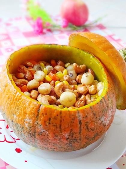 及以下步骤:倒入切好的胡萝卜丁翻炒。 加少许盐调味。 倒入掰好的玉米粒。 炒到玉米粒都饱满了就是熟了,加入少许鸡精调味。 把炒好的菜粒倒入蒸好的南瓜壳内。 均匀的撒上之前炒好的腰果。 倒入掰好的玉米粒。 炒到玉米粒都饱满了就是熟了,加入少许鸡精调味。 把炒好的菜粒倒入蒸好的南瓜壳内。 均匀的撒上之前炒好的腰果。