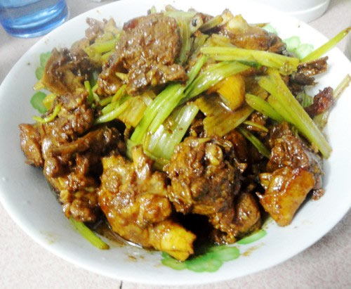 6、把芹菜灼水,加入焖好鸭肉中,翻炒,等芹菜吸入鸭肉汁。