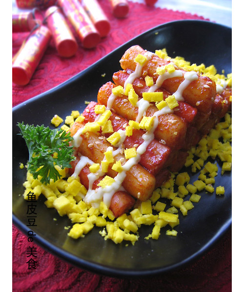 我的选题是热门的d组:团团圆圆+万事如意+步步高升+招财进宝 本道菜----步步高升:金灿灿的辣炒年糕(高)!(大家快来支持投票呀) 这是我做的第二道菜。过年吃年糕,取义步步高升。有些地方在过年时不吃米饭,因饭与犯谐音,所以常常在年夜饭的餐桌上出现年糕。 年糕可以自己做也可以买现成的,自己做的,更有特别的意义。往常会做一层层夹馅的年糕,今年换个样,与蟹棒辣椒同炒,一层层的摆好,撒上蛋黄碎,红红火火、金灿灿的感觉。祝愿朋友们,新年里,步步高升,金子堆成山。
