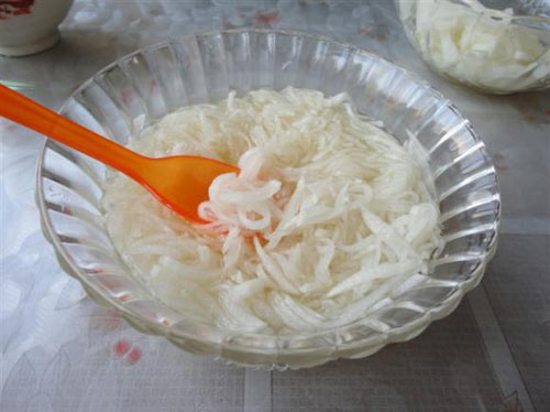 4、往白萝卜丝里加入适量的蜂蜜,喜欢甜的可以多加一些。