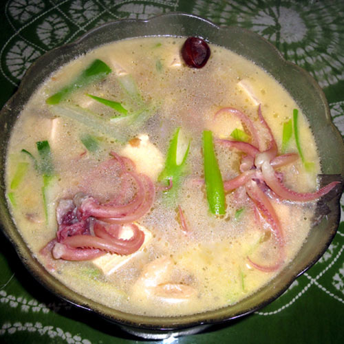 4、把炖好的高汤放入锅内,随后倒入,切好的蘑菇片和鸡腿菇片、鱿鱼头、蛤蜊、豆腐(注意豆腐也要用热水超抄过,这样是为了去豆醒味)盖上锅烧开后,用小火炖半小时后,放入葱段,即可装盘。