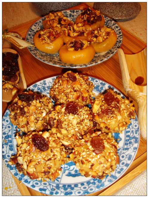 及以下步骤:用小汤匙将拌好的坚果放入压好的汤圆中间。 剩下的6个汤圆滚上一层坚果糖衣。 6个全部做好装盘。 果酒味的伏特加是用来浇在7号图的汤圆上的。 敲碎后放入碗中,加入芝麻,葡萄干拌匀。 煮好的汤圆放入分6个盘中,用汤匙压制中间带凹。 用小汤匙将拌好的坚果放入压好的汤圆中间。 剩下的6个汤圆滚上一层坚果糖衣。 6个全部做好装盘。 果酒味的伏特加是用来浇在7号图的汤圆上的。