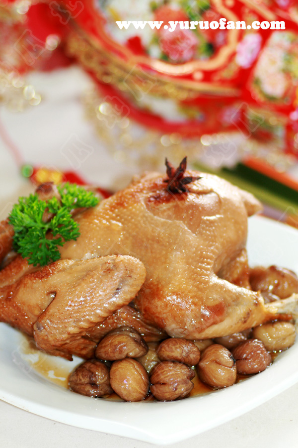 胡椒粉(1/2茶匙) / 盐(1/2茶匙) / 冰糖(20克) / 生抽(2汤匙) / 红辣椒(1只) / 八角(1粒) / 老抽(适量) / 老姜(4片) / 栗子(10粒) / 清鸡汤(150克) / 干龙眼(10个) / 春葱(2棵) / 蒜头粒(6粒) / 黑枣酒(1/3瓶)